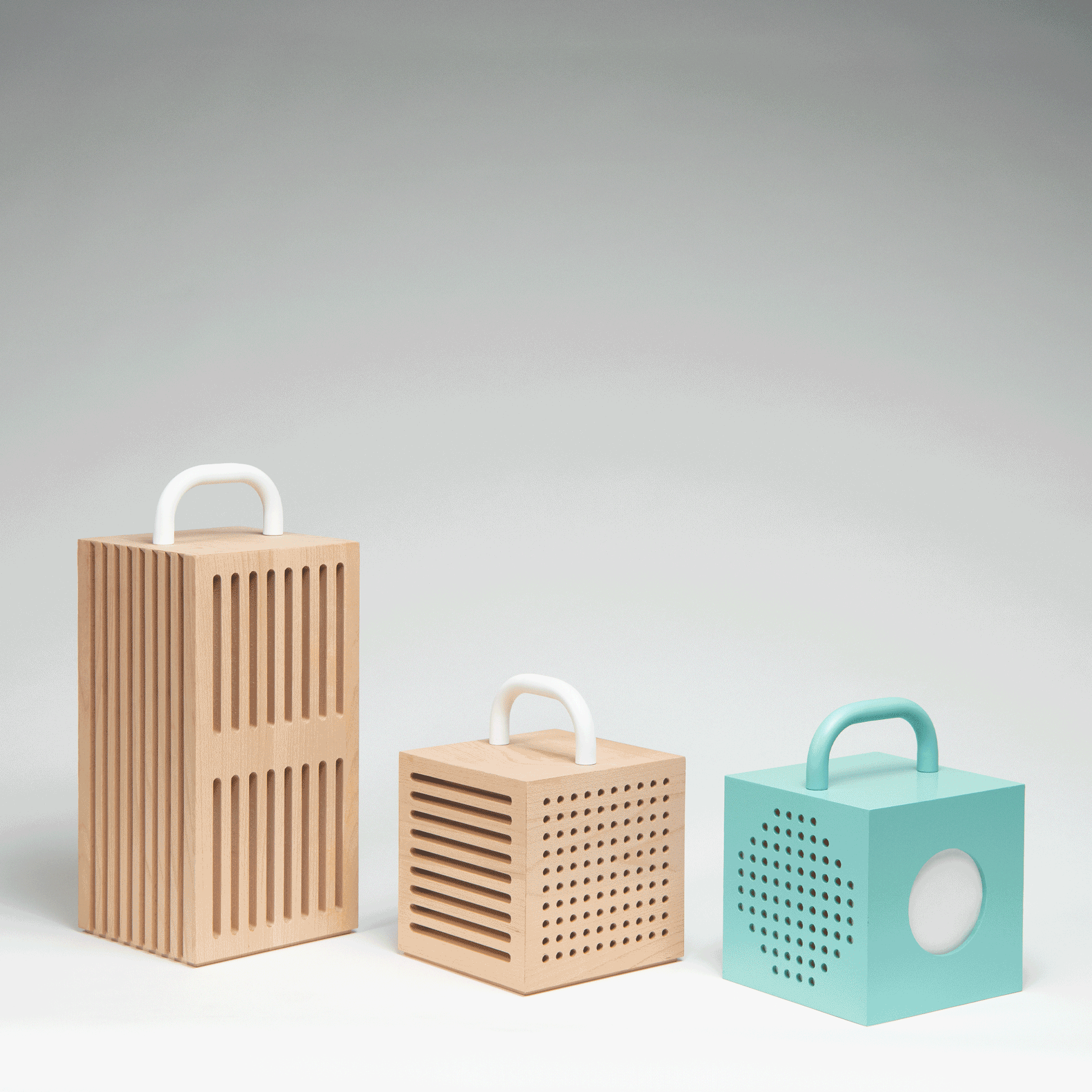 Stackable lamps, similar to the wooden doll speakers, and a white corner seat, perfect to lounge around and whip up some tunes or enjoy a book.